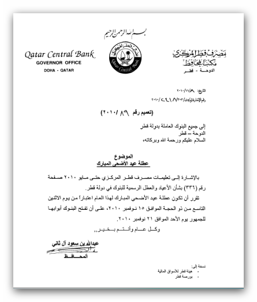 مصرف قطر المركزي يعلن إجازة عيد الأضحى