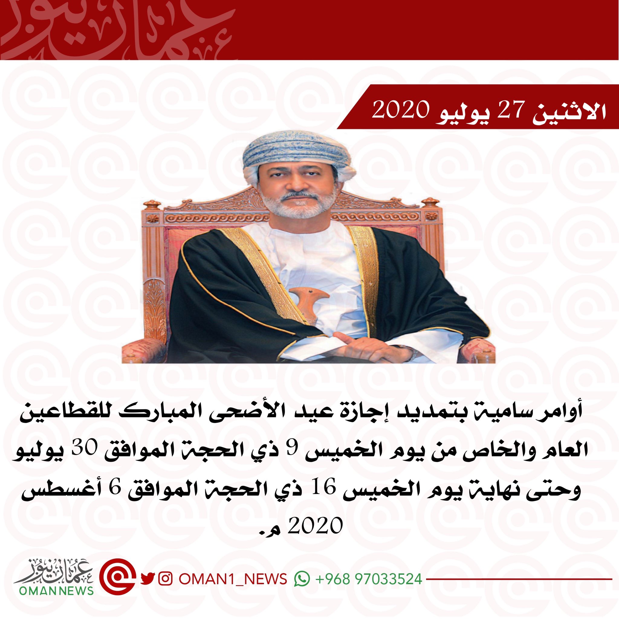 ع مان نيوز Oman News على تويتر عاجل أوامر سامية بتمديد إجازة عيد الأضحى المبارك للقطاعين العام والخاص من يوم الخميس 9 ذي الحجة الموافق 30 يوليو وحتى نهاية يوم الخميس 16