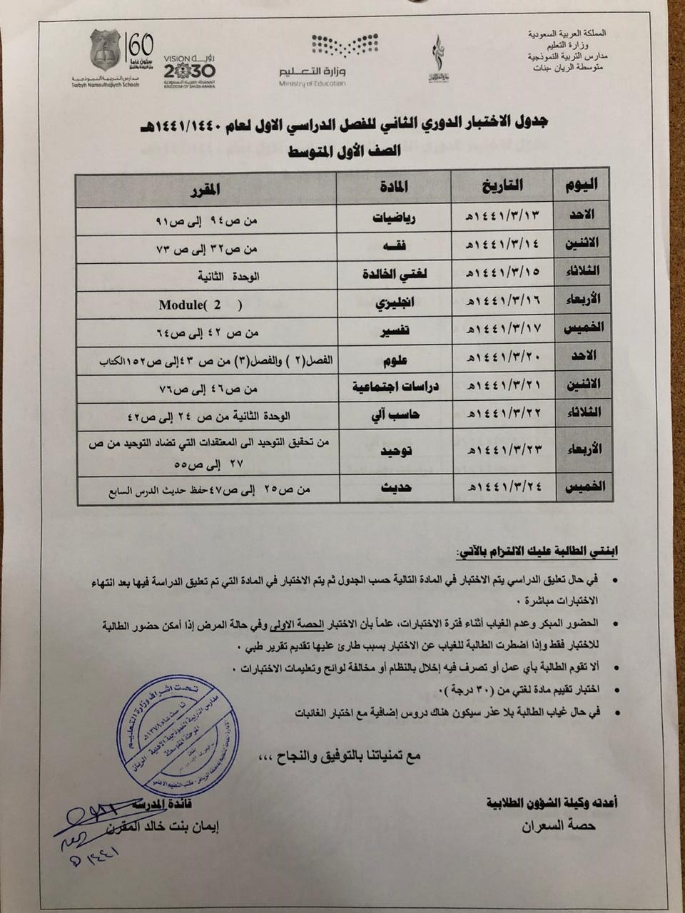 المتوسط بنات الريان جدول الاختبار الدوري الثاني للفصل الدراسي الأول لعام 1441 1440هـ