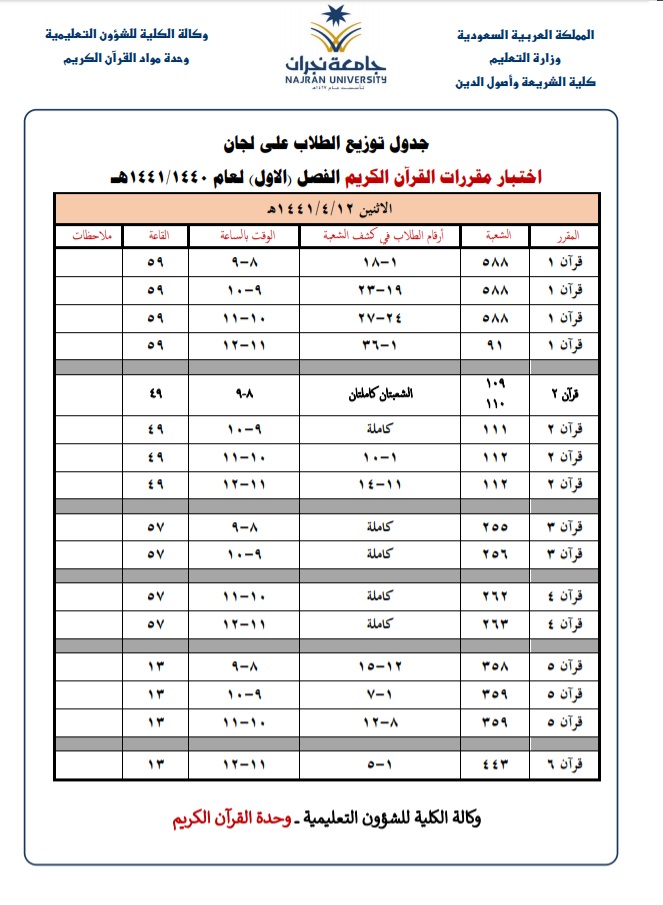 مكتب الانتساب يعلن جدول اختبارات الفصل الدراسي الأول ١٤٤٠ ١٤٤١هـ الكلية الجامعية بالقنفذة جامعة أم القرى