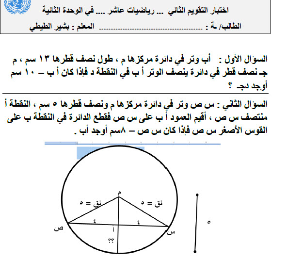 امتحان في الوحدة الثانية لمادة الرياضيات للصف العاشر الفصل الاول 2017 2018