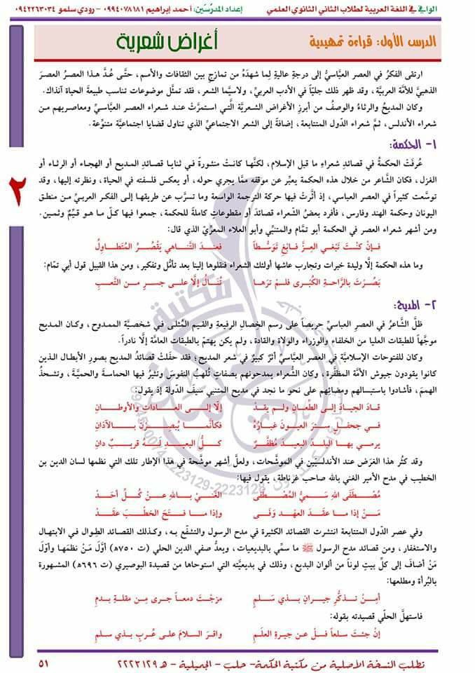 حل الوحدة الثانية في اللغة العربية الصف الثاني الثانوي العلمي الفصل الاول 2018 2019