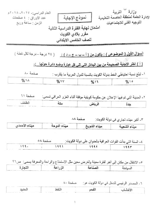 منطقة العاصمة التعليمية نموذج الاجابة اجتماعيات الفترة الثانية للصف الخامس 2017 2018 مدرستي الكويتية