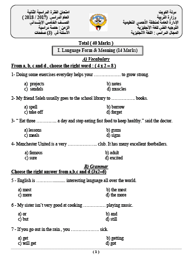 امتحان نهاية الفترة الثانية لغة إنجليزية للصف الخامس منطقة الأحمدي التعليمية 2017 2018 مدرستي الكويتية